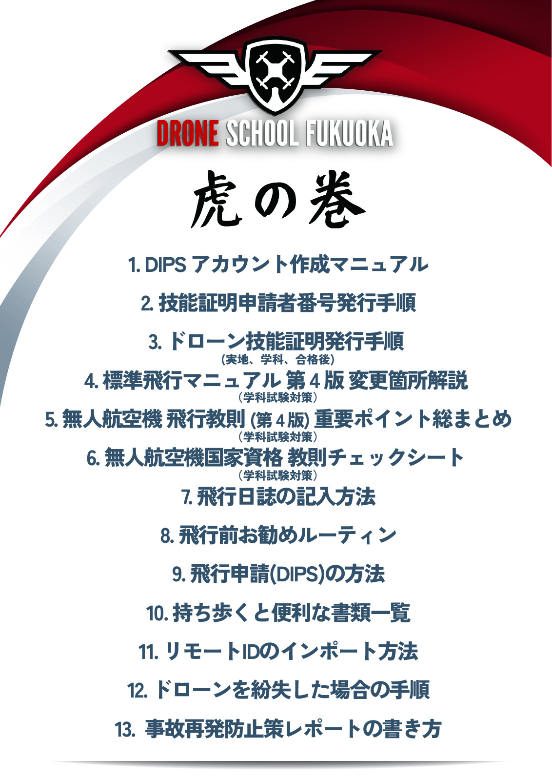 そんな皆様に、受講後に即役立つ申請方法や事故対策などを記したドローンスクール福岡オリジナル「虎の巻」(手引き集)をプレゼント!